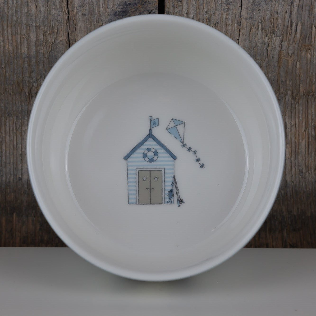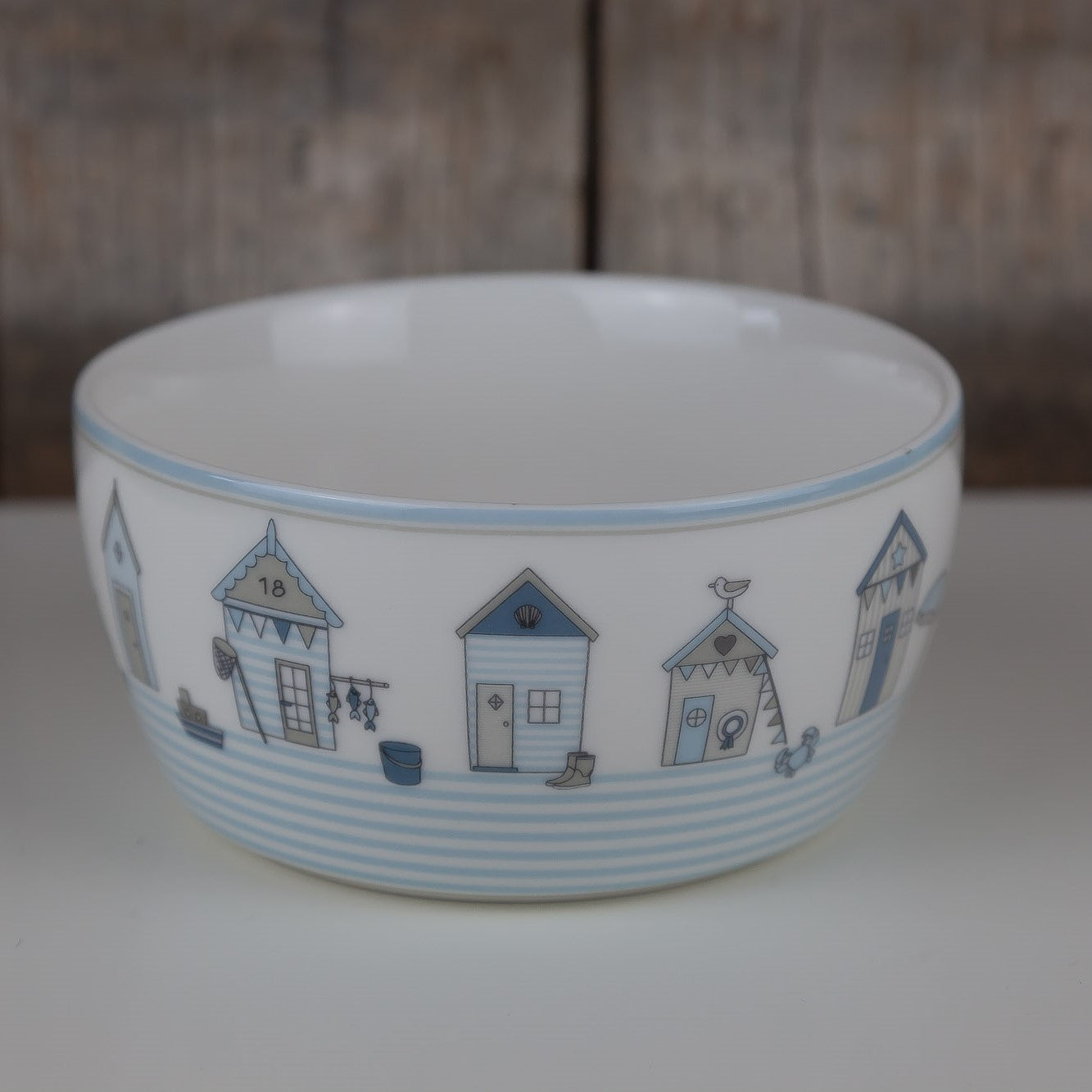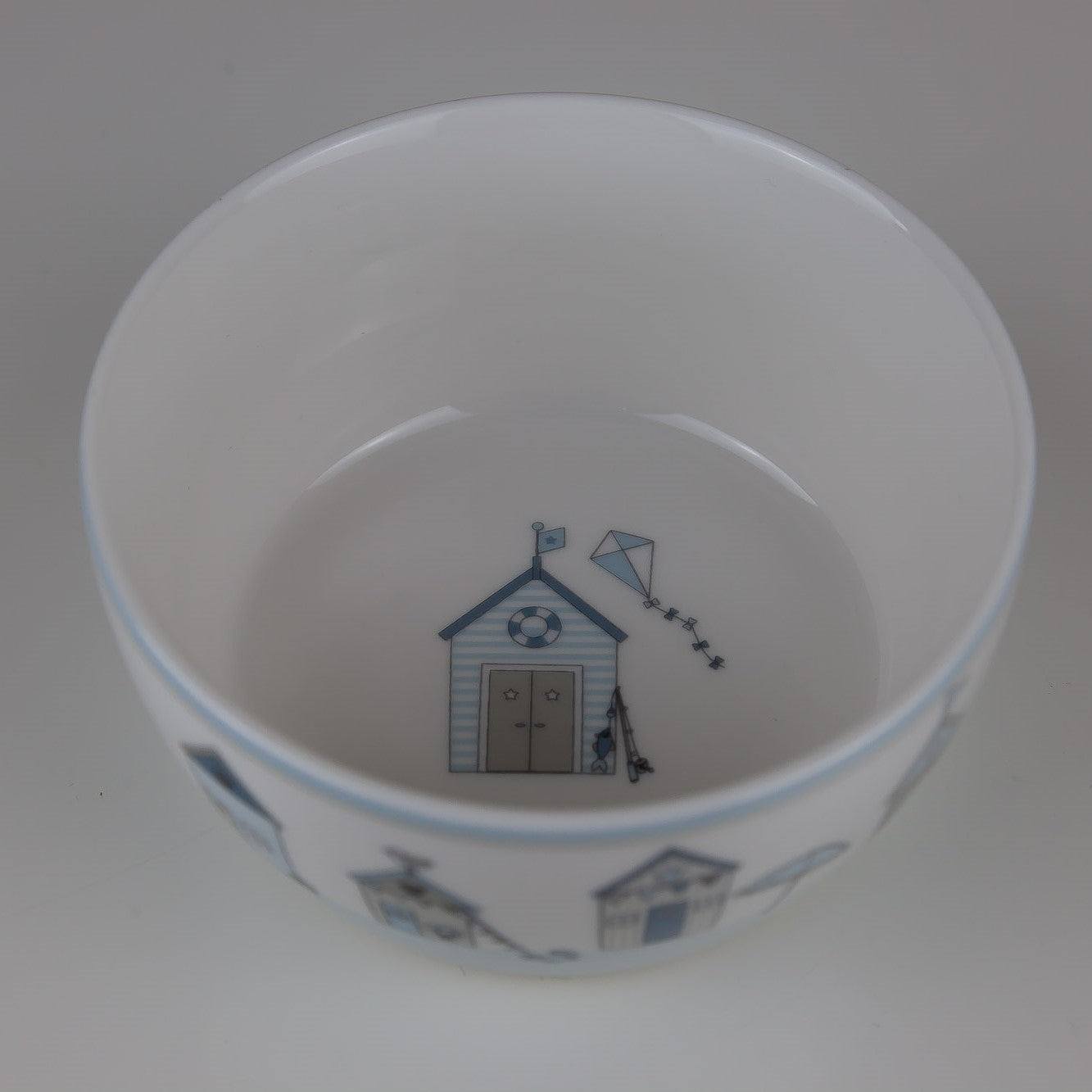 Die Serie Ellison zeigt ein maritimes Motiv mit kleinen Strandhäuschen in zarten blau Tönen.