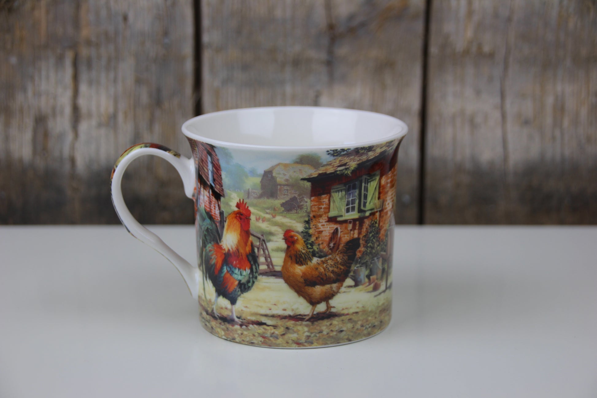 Das Design Cockerel & Hen zeigt ein natürliches Landmotiv mit Hahn und Hühner Motiven.